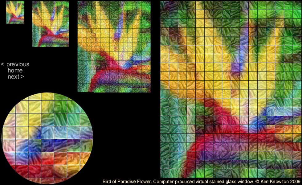 Bird of Paradise, virtual stained glass window, Ken Knowlton, Portrait Artist, Computer Scientist, Computer Assisted Art, Knowlton Mosaics